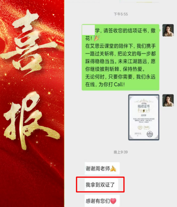 867又一学员通过艾思云课堂论文辅导拿到双证,顺利毕业啦!辅导的论文还被推荐为优秀论文!